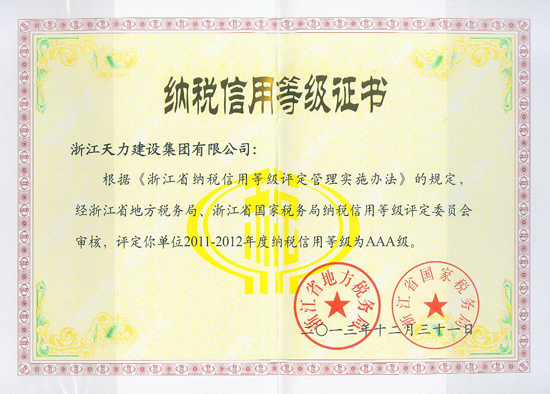 2011-2012年度納稅信用等級(jí)AAA級(jí)