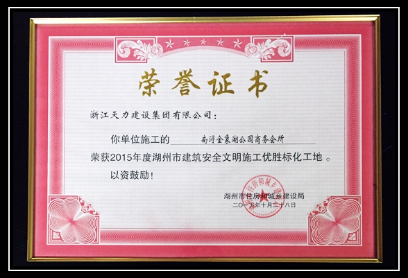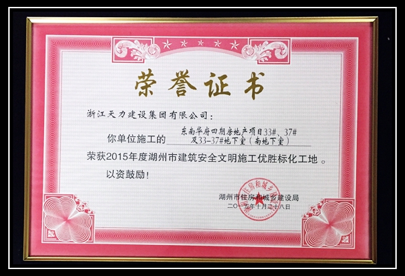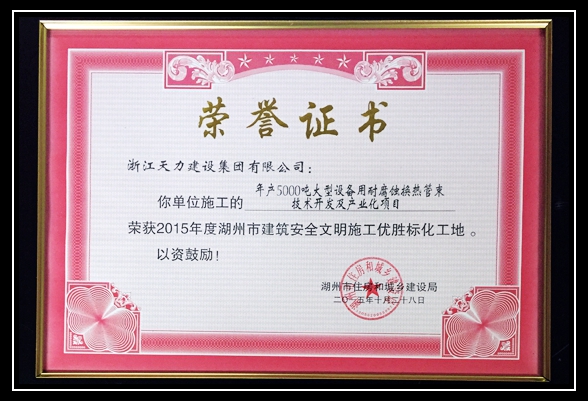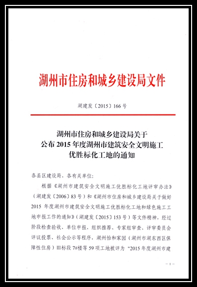 2015年度湖州市建筑安全文明優(yōu)勝標(biāo)化工地-湖州市教育局湖州市仁北小學(xué)工程二標(biāo)段、年產(chǎn)5000噸大型設(shè)備用耐腐蝕換熱管束技術(shù)開(kāi)發(fā)及產(chǎn)業(yè)化項(xiàng)目、南潯金象湖公園商務(wù)會(huì)所、東南華府四期房地產(chǎn)項(xiàng)目