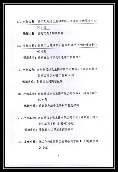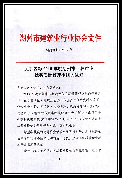 2019年度湖州市工程建設優秀質量管理小組