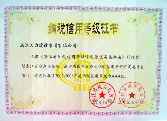 2007-2008年度納稅信用等級(jí)證書AAA級(jí)