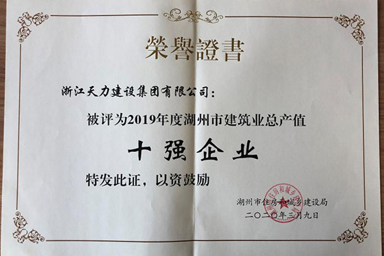 2019年度湖州市建筑業總產值十強企業