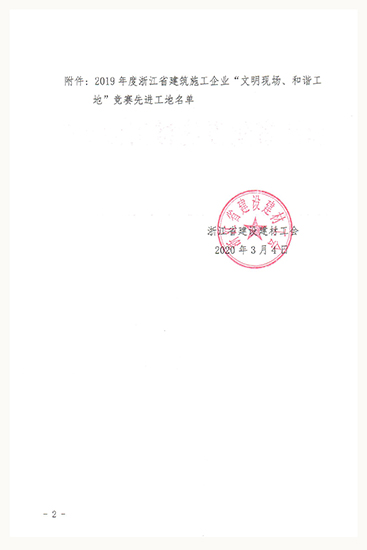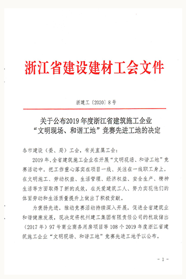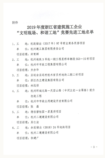 2019年度浙江省建筑施工企業“文明現場、和諧工地”競賽先進工地