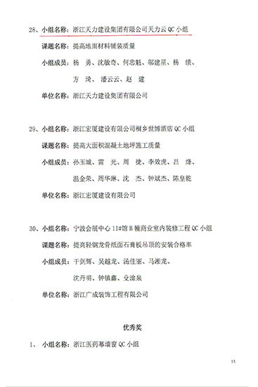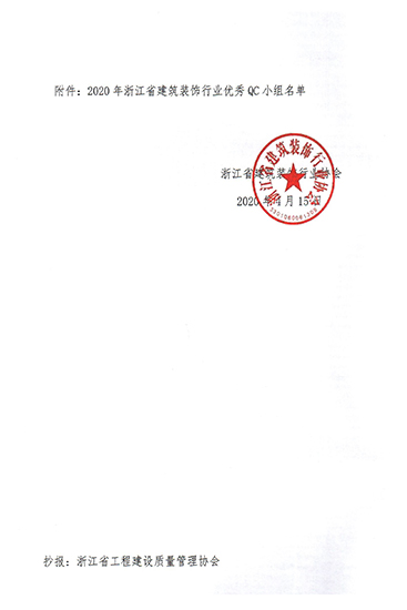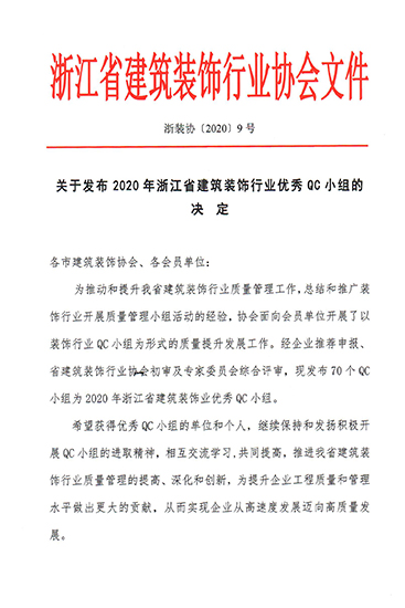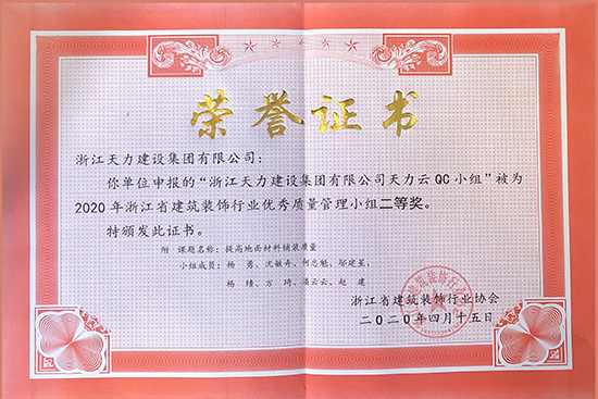 天力云QC小組被評(píng)為2020年浙江省建筑裝飾行業(yè)優(yōu)秀質(zhì)量管理小組二等獎(jiǎng)