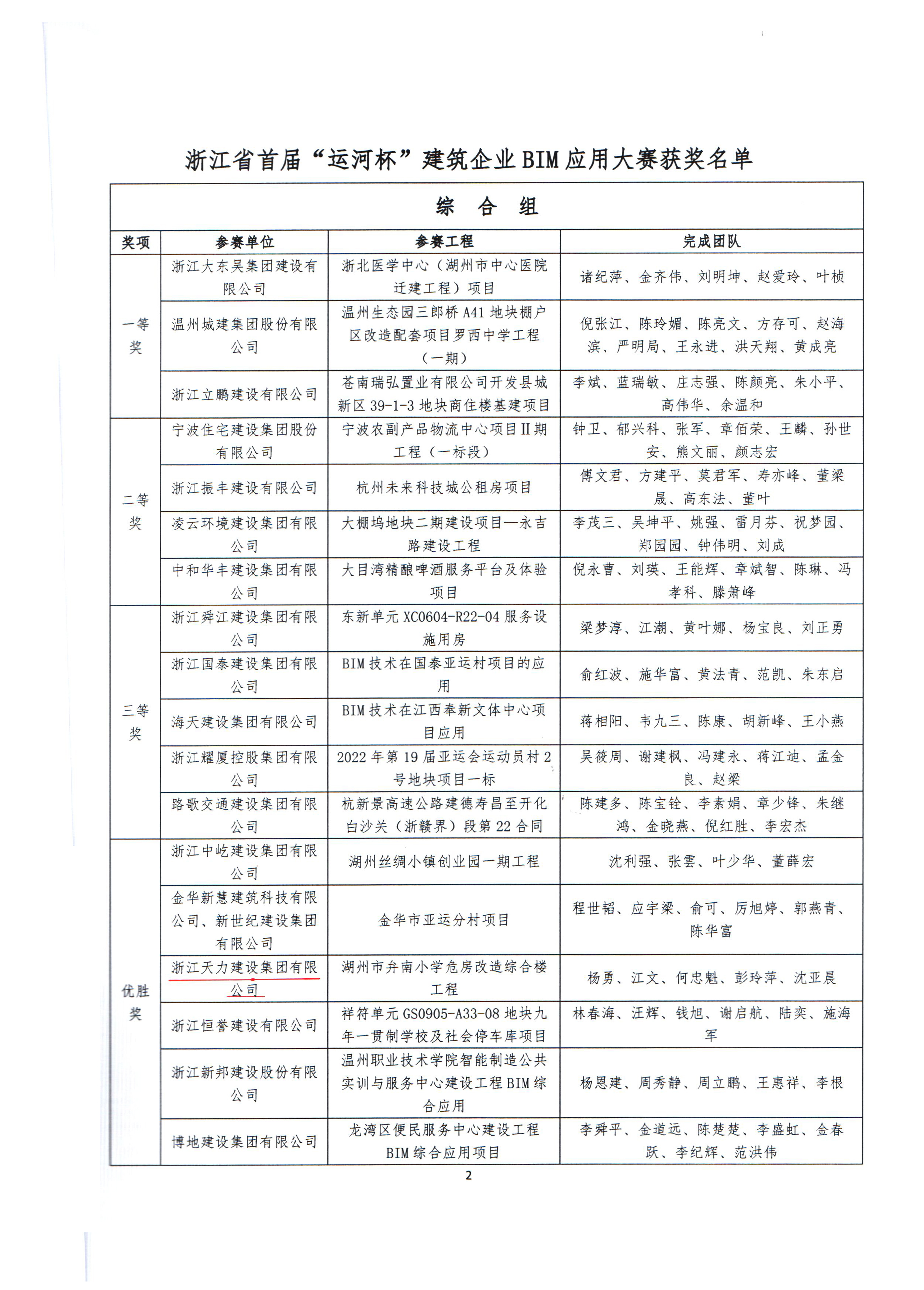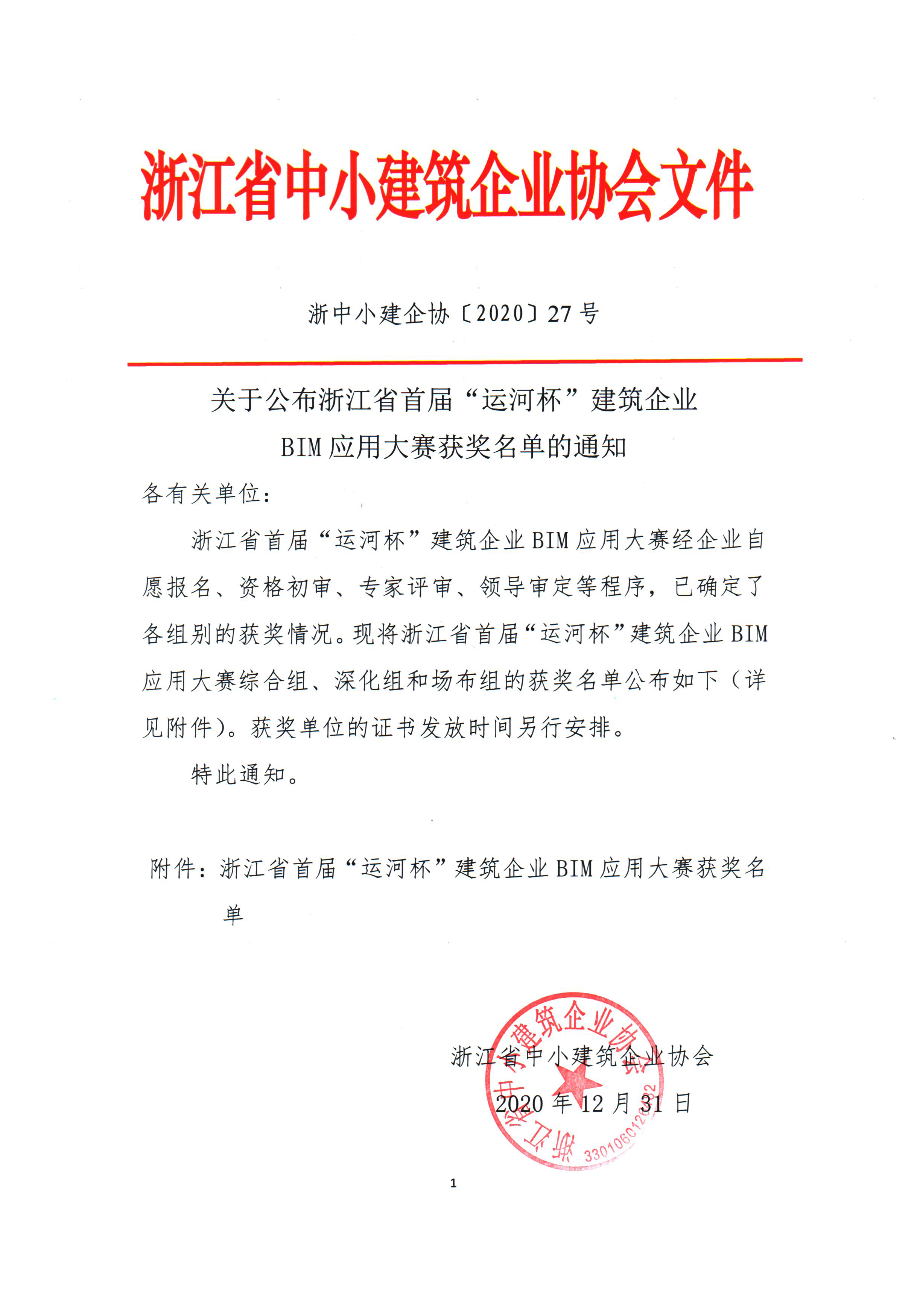 浙江省首屆“運河杯”建筑企業(yè)BIM應用大賽獲獎