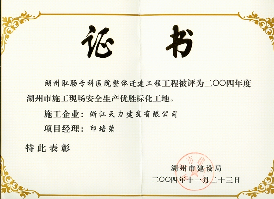 湖州肛腸?漆t(yī)院整體遷建2004年度湖州市優(yōu)勝標化