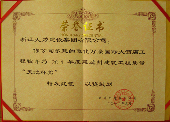 敦化萬豪國際大酒店工程被評為2011年度延邊州建筑工程質量“天池杯獎”