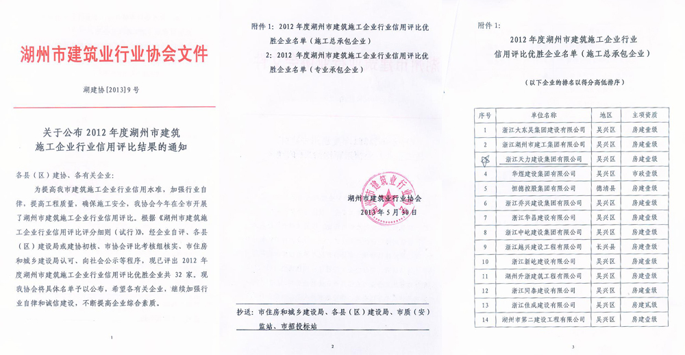 2012年度湖州市建筑施工企業(yè)行業(yè)信用評比優(yōu)勝企業(yè)