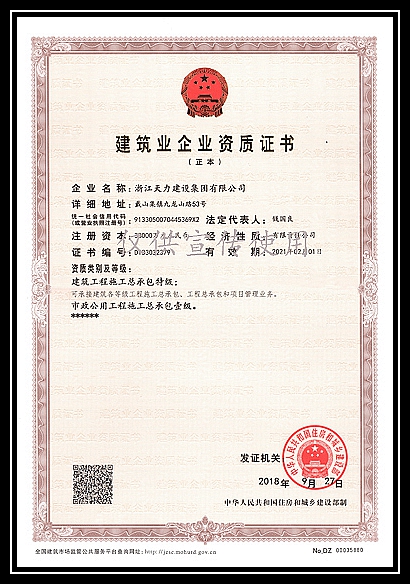 2018年9月30日,國家住房和城鄉建設部發布《關于核準2018年度第七批建設工程企業資質名單的公告》(中華人民共和國住房和城鄉建設部公告2018年第223號)浙江天力建設集團有限公司成功榮升為房屋建筑工程施工總承包特級資質,天力人孜孜不倦為之奮斗多年的戰略目標終于實現。