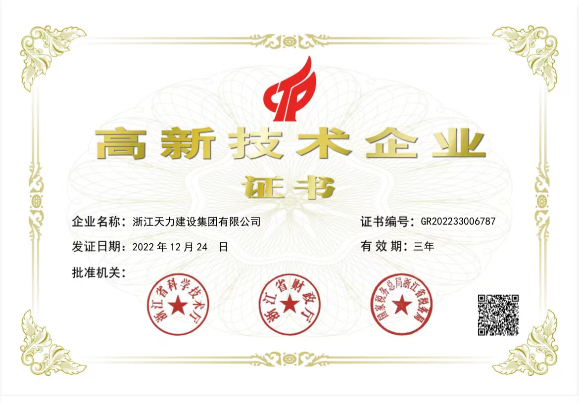 近日,浙江天力建設集團有限公司榮獲由浙江省科學技術廳、浙江省財政廳和國家稅務總局浙江省稅務局聯(lián)合頒發(fā)的“高新技術企業(yè)”認定證書,由此正式邁入國家高新技術企業(yè)行列。